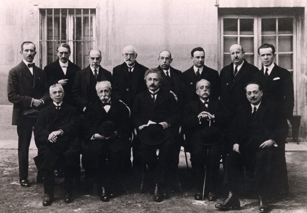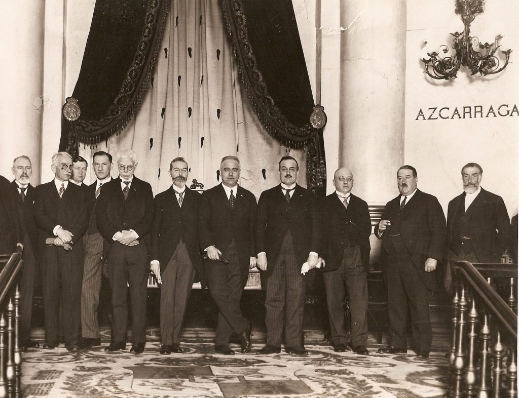 Algunos de los delegados extranjeros que acudieron en 1928 a las celebraciones de las bodas de plata de la RSEFQ. En la foto (en el Senado) aparecen los premios Nobel de física M. Siegbahn y P. Zeeman (cuarto y quinto por la izquierda) y F. Haber, Nobel de química (tercero por la derecha).
