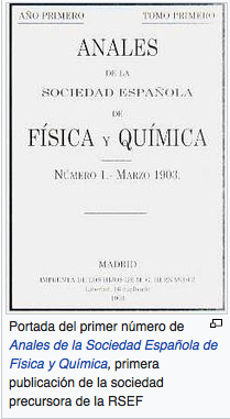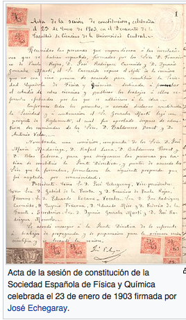 *Textos y fotografías procedentes del artículo de ANTONIO MORENO GONZÁLEZ: «La Sociedad Española de Física y Química: una institución para la regeneración patria», en REVISTA ESPAÑOLA DE FÍSICA, Vol. 12, Número 4, 1998. Págs. 14-17.
